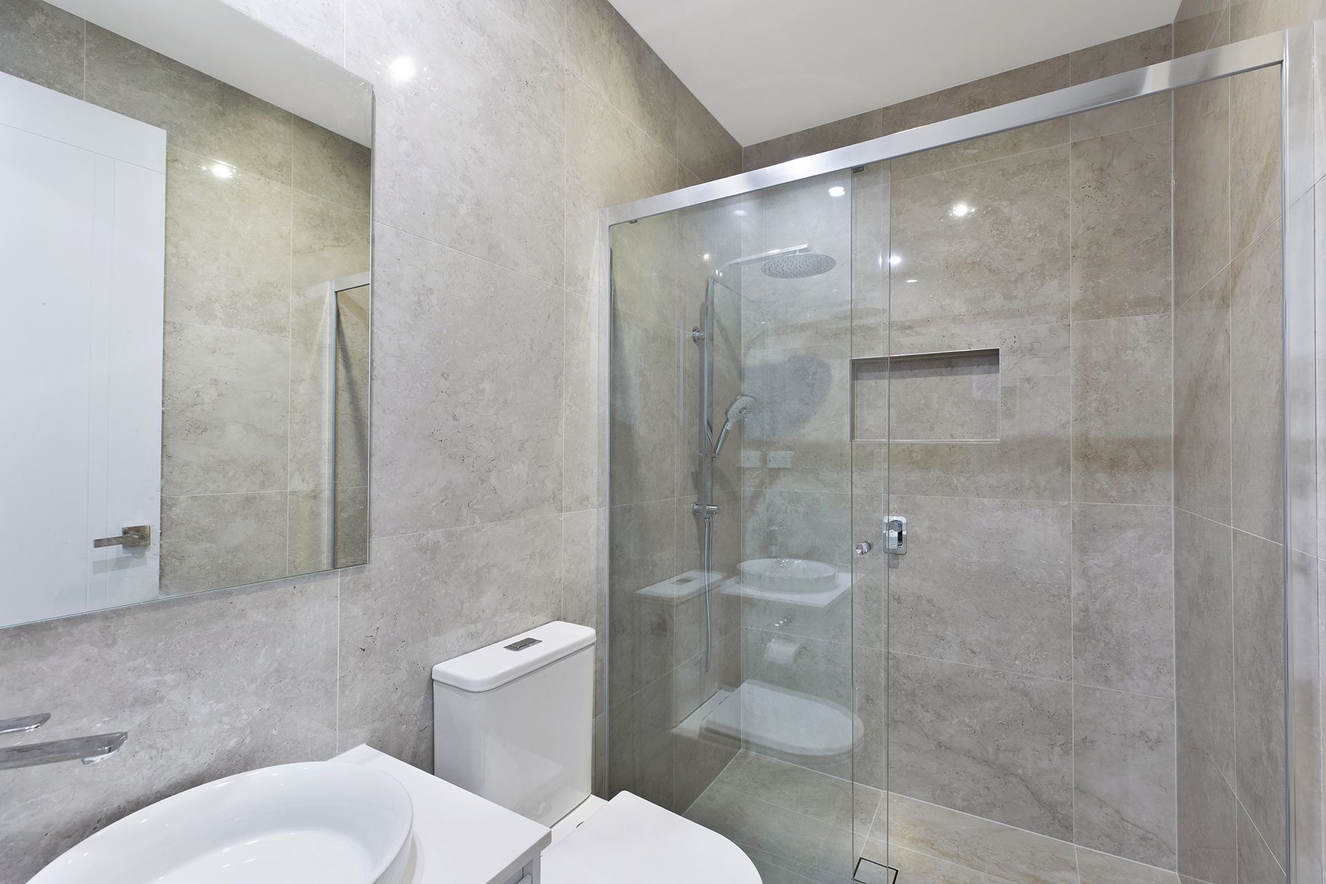 – Sleek kitchen with stone benchtops, gas cooktop and dishwasher.